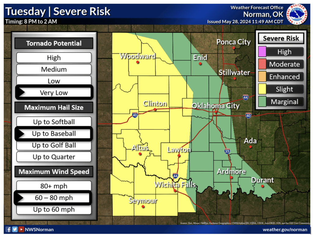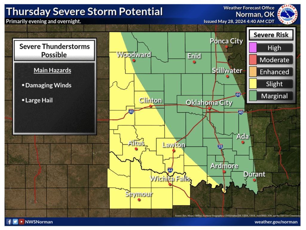 Below, see the 7-day forecast and storm potential outlook provided by the Oklahoma Mesonet.