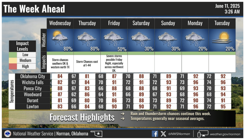 Below, see the 7-day forecast provided by the Oklahoma Mesonet.