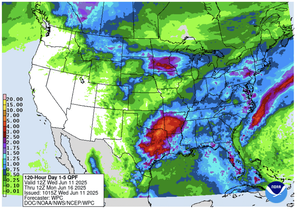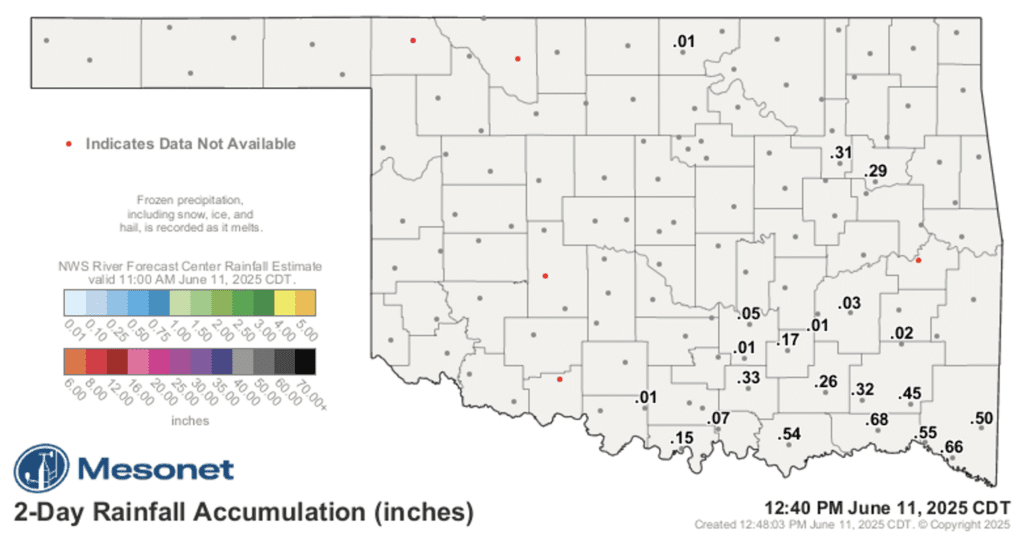 The Days 1-5 Precipitation Forecast is produced by the National Weather Service’s Weather Prediction Center for June 11-16, 2025. See 2-Day Rainfall Accumulation (inches) measured by Oklahoma Mesonet. Please note several places have high humidity and received large amounts of moisture over the past 5 days which has hindered harvest in many locations.