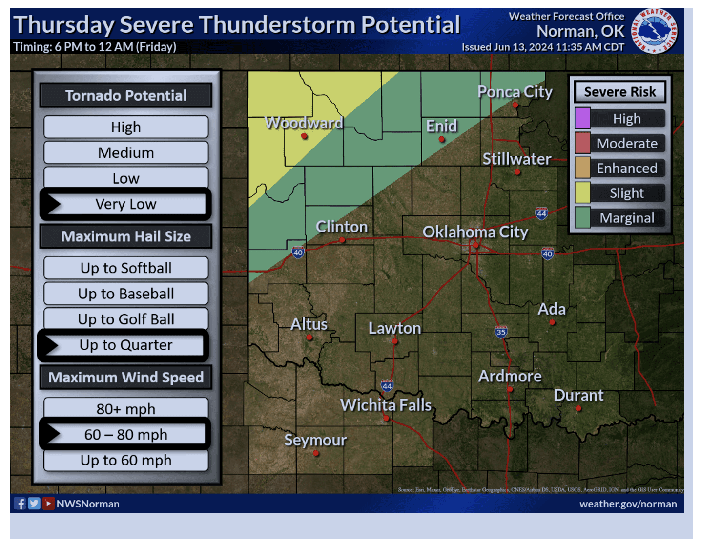 Below, see the 7-day forecast provided by the Oklahoma Mesonet, with storm alerts for the Panhandle and Northwestern Oklahoma for this Thursday afternoon/evening.