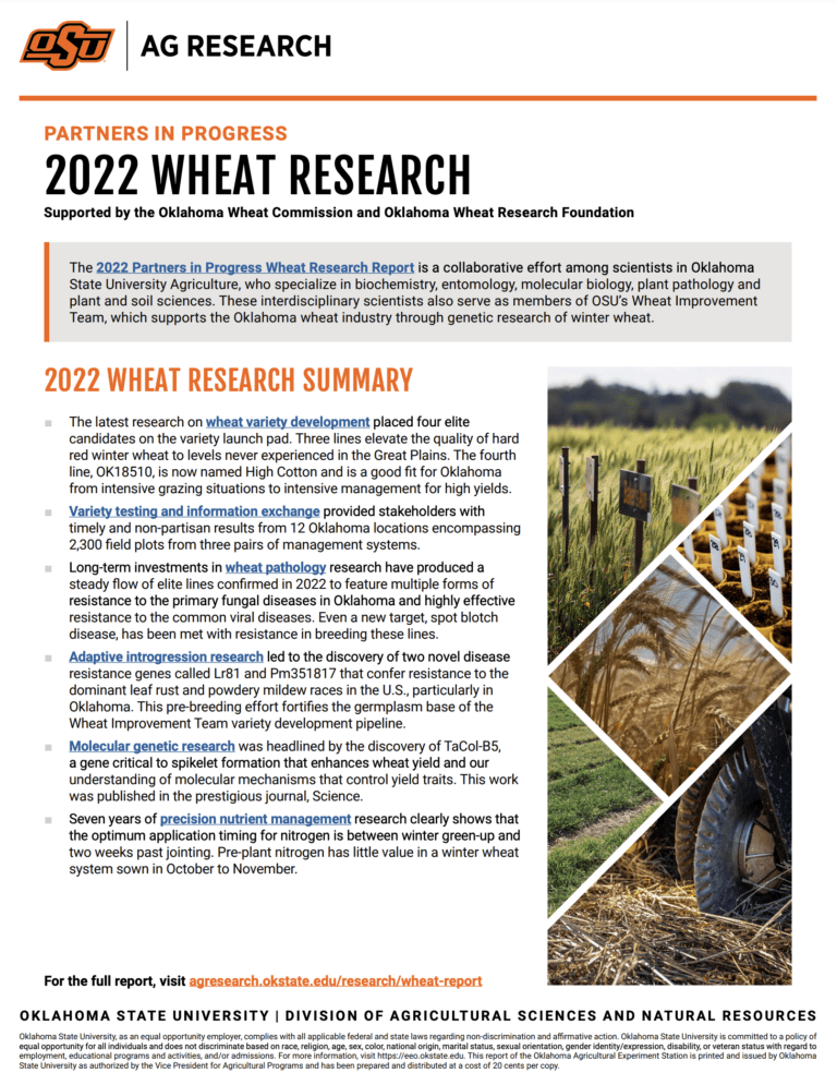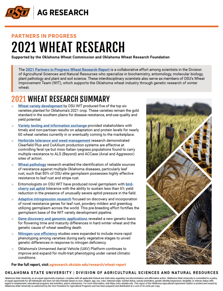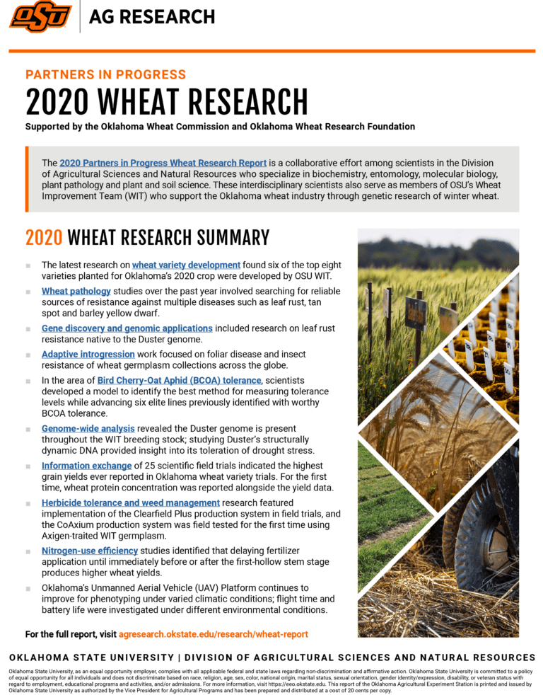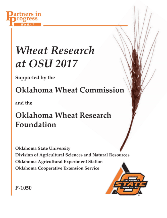 The Partners in Progress Wheat Research Report is one of a series of annual reports from DASNR highlighting research results and impacts of funded projects. This information is utilized throughout the year in educational wheat programs and is distributed to Oklahoma wheat producers to keep them up-to-date on the latest research findings. The research contained in this report has been directed as closely as possible to meet the needs of Oklahoma wheat producers.