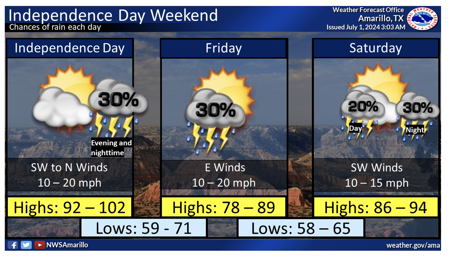 Below see the Tuesday evening thunderstorm potential and rain chances for the Panhandle over the Independence Day weekend.